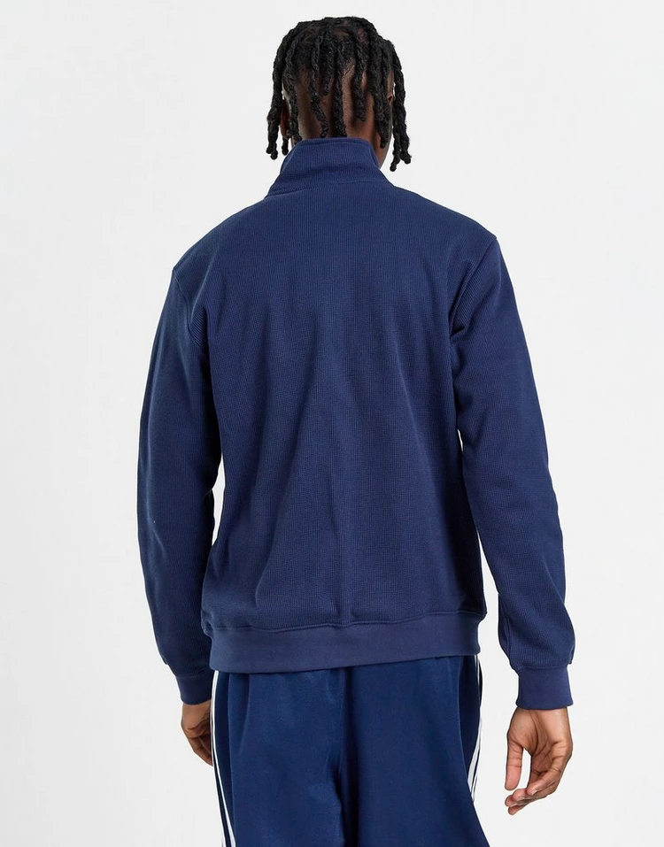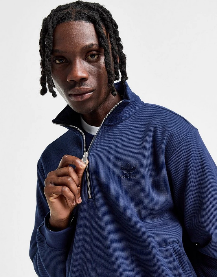 Mettez à jour vos superpositions avec ce sweat-shirt à demi-zip gaufré pour homme d’adidas Originals. Dans un coloris bleu marine, ce sweat-shirt à coupe standard est fabriqué à partir d’un mélange poly-coton doux qui utilise du polyester recyclé. Il présente une finition texturée gaufrée et comporte une fermeture à demi-zip avec un col montant. Avec des manches longues et des bordures côtelées extensibles pour sécuriser la coupe, ce sweat-shirt est orné d’un logo trèfle adidas Originals ton sur ton brodé sur la poitrine. Lavable en machine. | ​​Notre mannequin mesure 1,83 m avec un tour de poitrine de 89 cm et porte une taille M. | IY2299